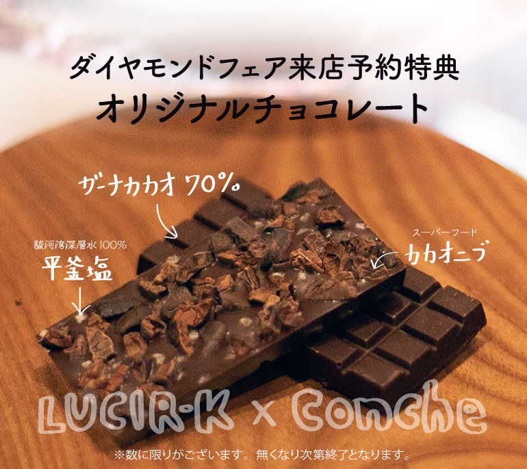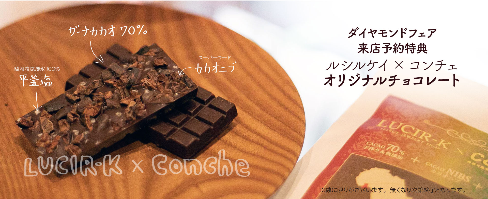2021年3月5日(金)~7日(日)の3日間、チョコレート専門店のConcheさんとコラボレーションして、ダイヤモンド&チョコレートフェアを開催することになりました!期間中は、ルシルケイ店内で様々なチョコレートを食べ比べいただけます。