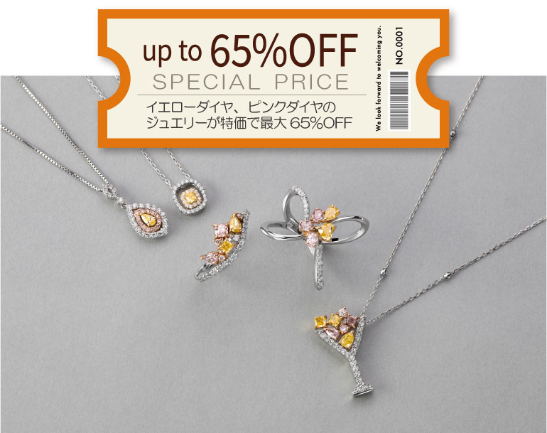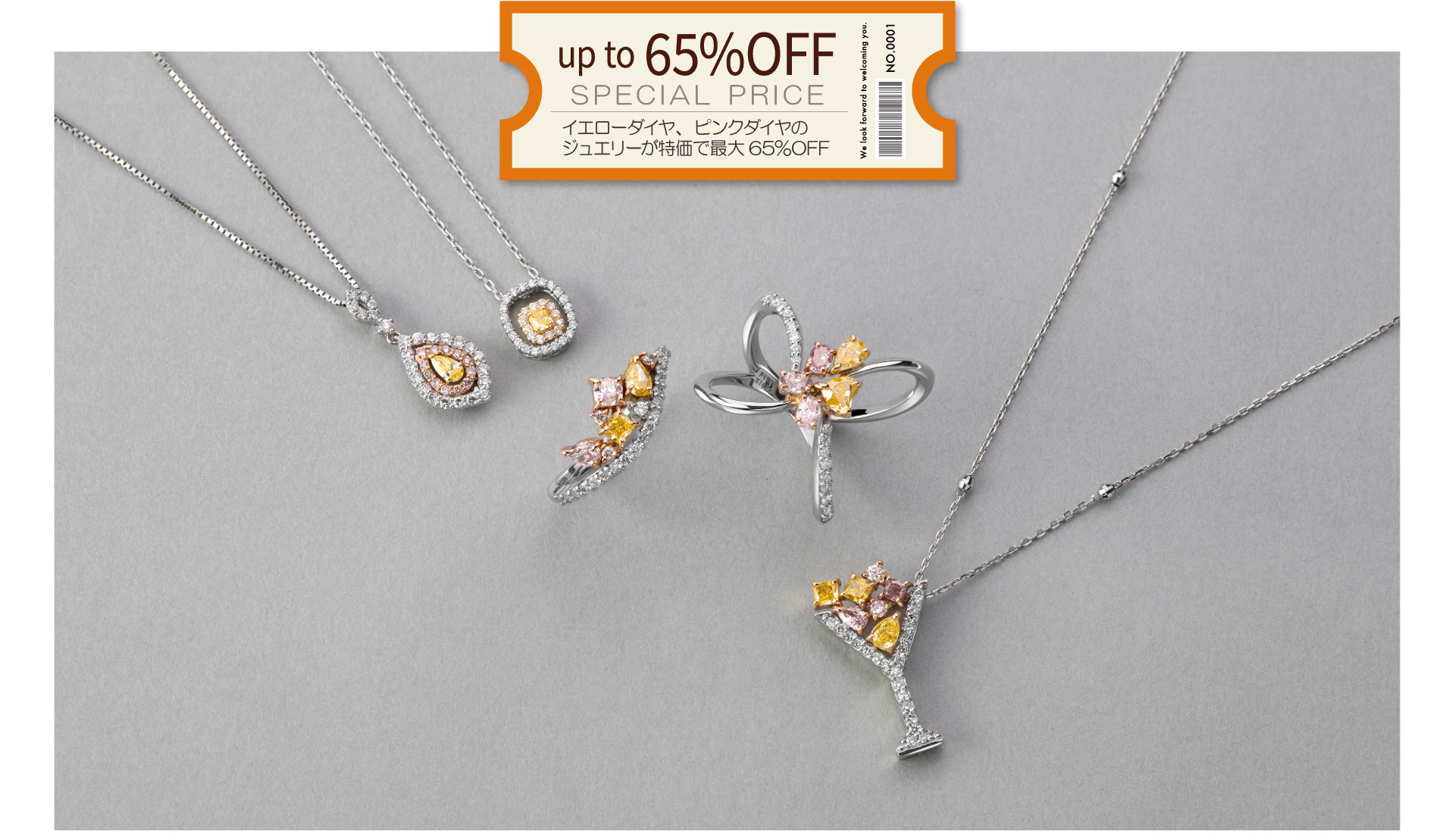 Pt/K18/K18PGダイヤネックレス(FIOY/SI1/0.24/PD0.07/D0.094ct)¥770,000→¥297,000 ・ Pt/K18ダイヤネックレス(FIY/VS1/0.078/D0.12ct)¥495,000→¥198,000 ・ Pt/K18/K18PGピンクダイヤリング(0.528/0.25ct)¥1,320,000→¥495,000 ・ Pt/K18/K18PGダイヤリング(0.686/0.16ct)¥1,760,000→¥660,000 ・ Pt/K18/K18PGダイヤネックレス(0.501/0.19ct)¥1,540,000→¥594,000