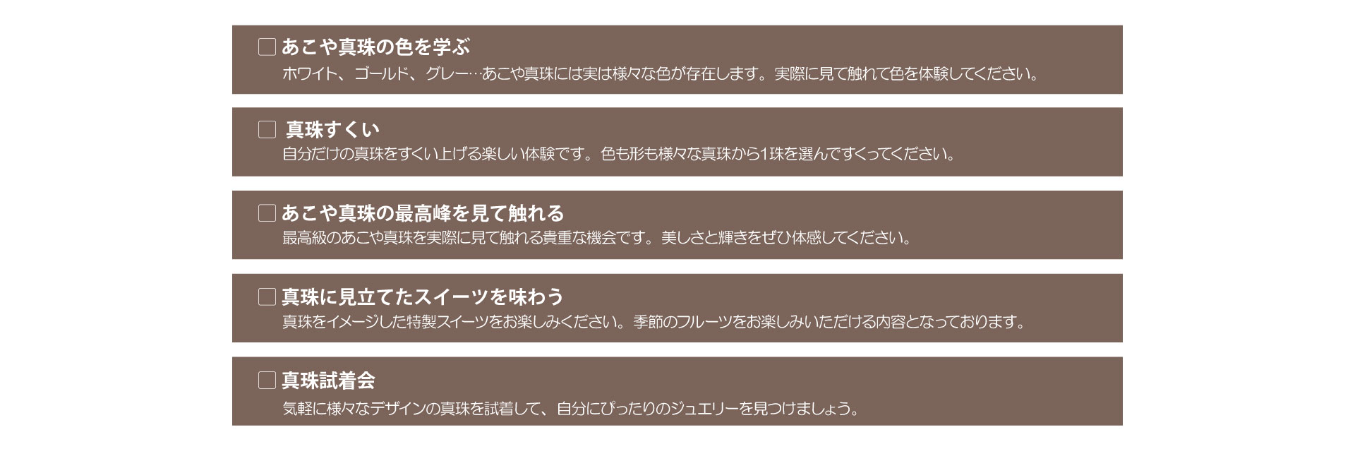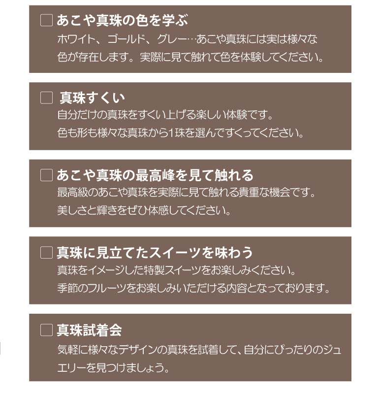 真珠の輝きや楽しさを五感で感じていただけるツアー内容となっており、見て、触れて、味わって、学べる特別な体験が待っています。前回からバージョンアップしておりますので、ぜひお楽しみいただけたら幸いです。