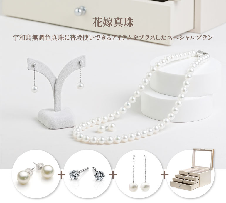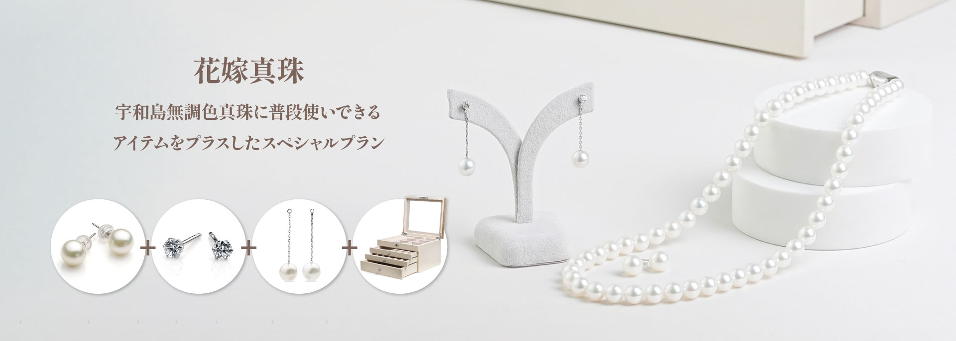結婚されるお嬢様へ、お父様・お母様から贈る記念品として「花嫁真珠プラン」をご用意。大人の女性の必需品として、嫁入り道具として、一生大切にお使いいただける特別な真珠に、普段使いできるアイテムが付いてくる人気のセットです。