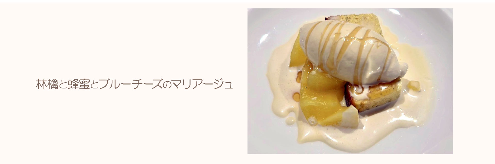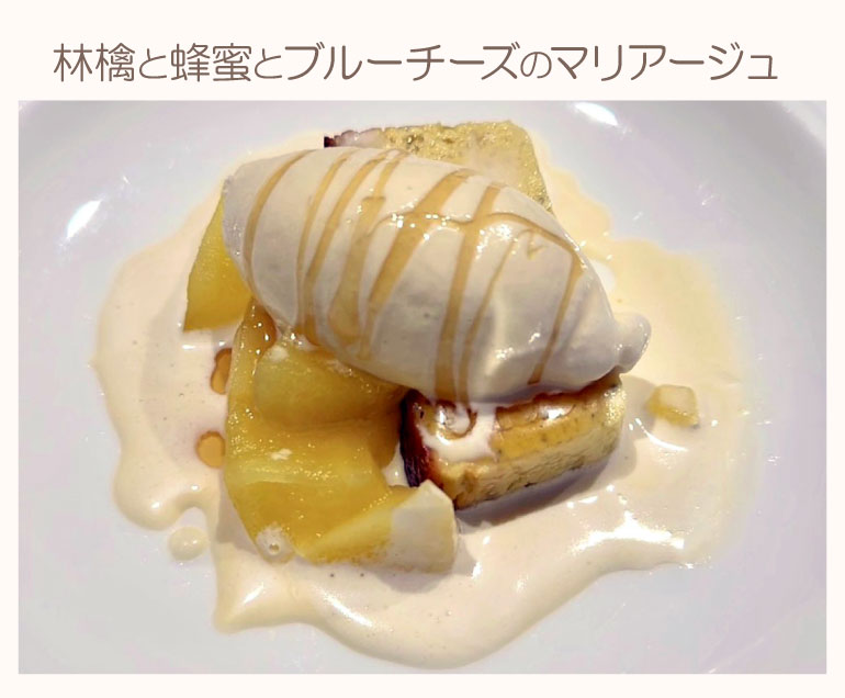お召し上がりいただけます。季節の果物・林檎を使ったデザートは蜂蜜とブルーチーズを掛け合わせた特別な一品。どのようなマリアージュになるのでしょうか?