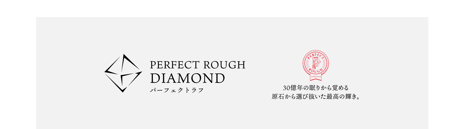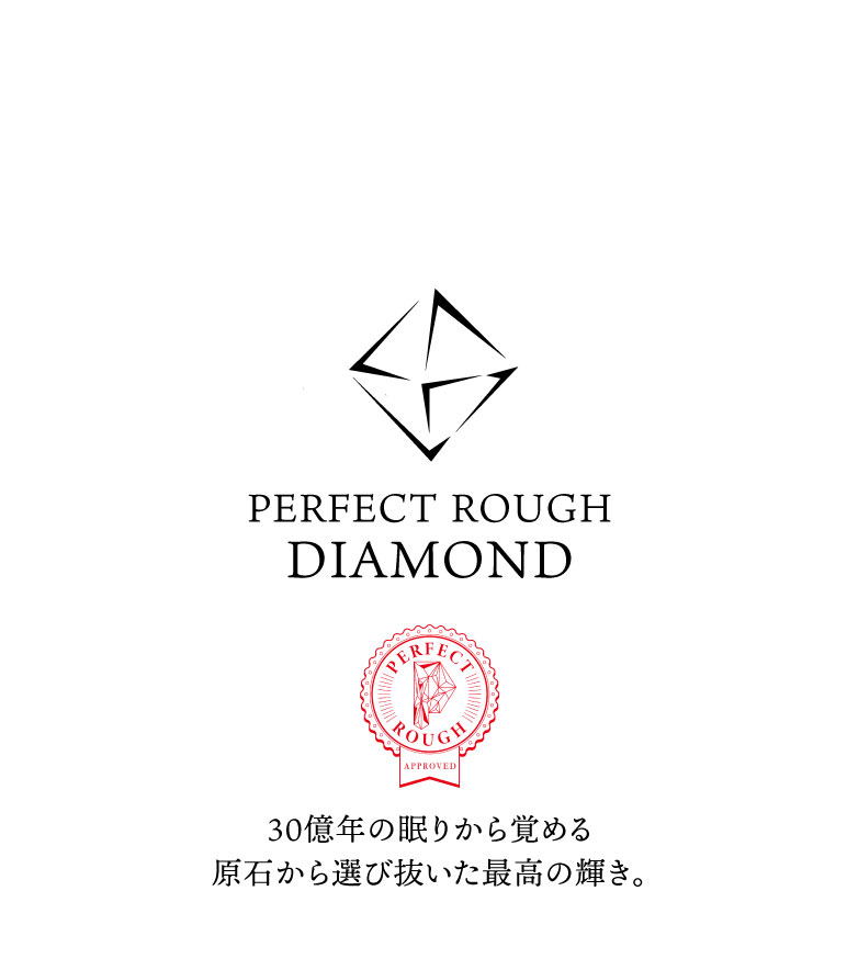 そもそも、宝飾用に用いることができるダイヤモンド原石はダイヤモンド 原石全体の5%に限られているのですが、その中でも正八面体の原石である ソーヤブルは15%しか産出できません。その中から、さらに選別した約3% のダイヤモンド原石にPERFECT ROUGHの称号を与えます。 PERFECT ROUGHは原石全体のわずか0.02%の奇跡なのです。つまり未加工のダイヤモンドにおいて、特に品質が高いものがPERFECT ROUGHです。