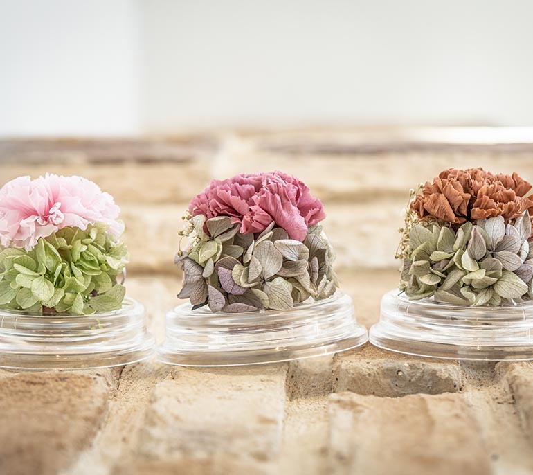 ナチュラルなカーネーションがドームの中に可愛く咲いています。母の日限定の人気ギフトセット。