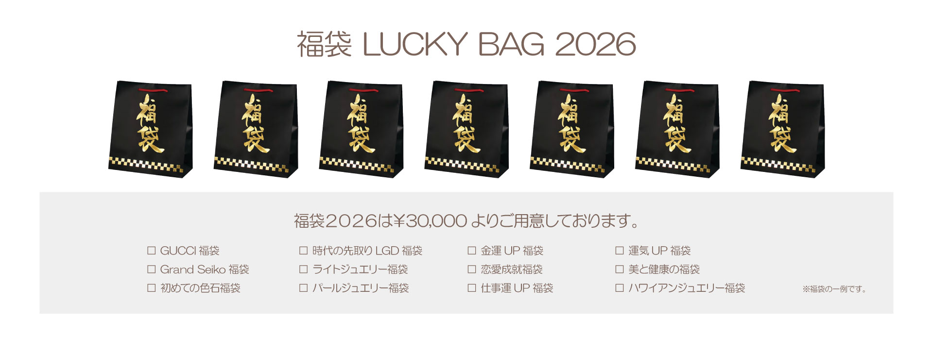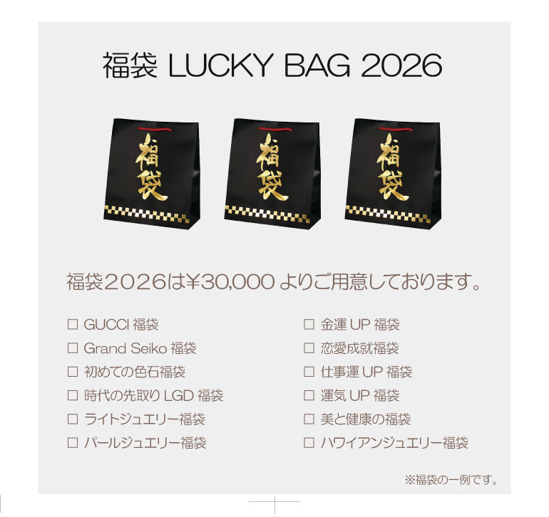 ルシルケイの福袋は恒例のメインアイテムを選べる豪華な福袋。毎年好評をいただいておりますが、12月8日(月)より予約を開始させていた空きます。販売価格は¥30,000~!ジュエリーはもちろん、中にはROLEXやCartier等の高級時計の福袋等もご用意しております。その他、テーマに合わせて様々な企画福袋があり、あなたにぴったりの福袋がきっと見つかるはずです。福袋はすべて一点物です。数に限りがございますので、どうぞお早めにご来店くださいませ。